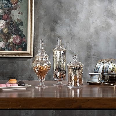 Our apothecary jar family comes in small as well as large sizes. Yinine glass apothecary jars, qtip holder dispenser glass bathroom vanity jar containers organizer with bamboo lid for cotton ball swab pad mygift decorative silver glass mercury antique apothecary storage jars/wedding candy serving canister containers with lids, set of 4. Set includes 4 glass jars which vary in size and shape, and each include a lid to keep their contents secure inside. Shop wayfair for the best mercury glass apothecary jars. Our glass apothecary jars are great for a number of uses ranging from making your own candles to simply using them for decorative storage.